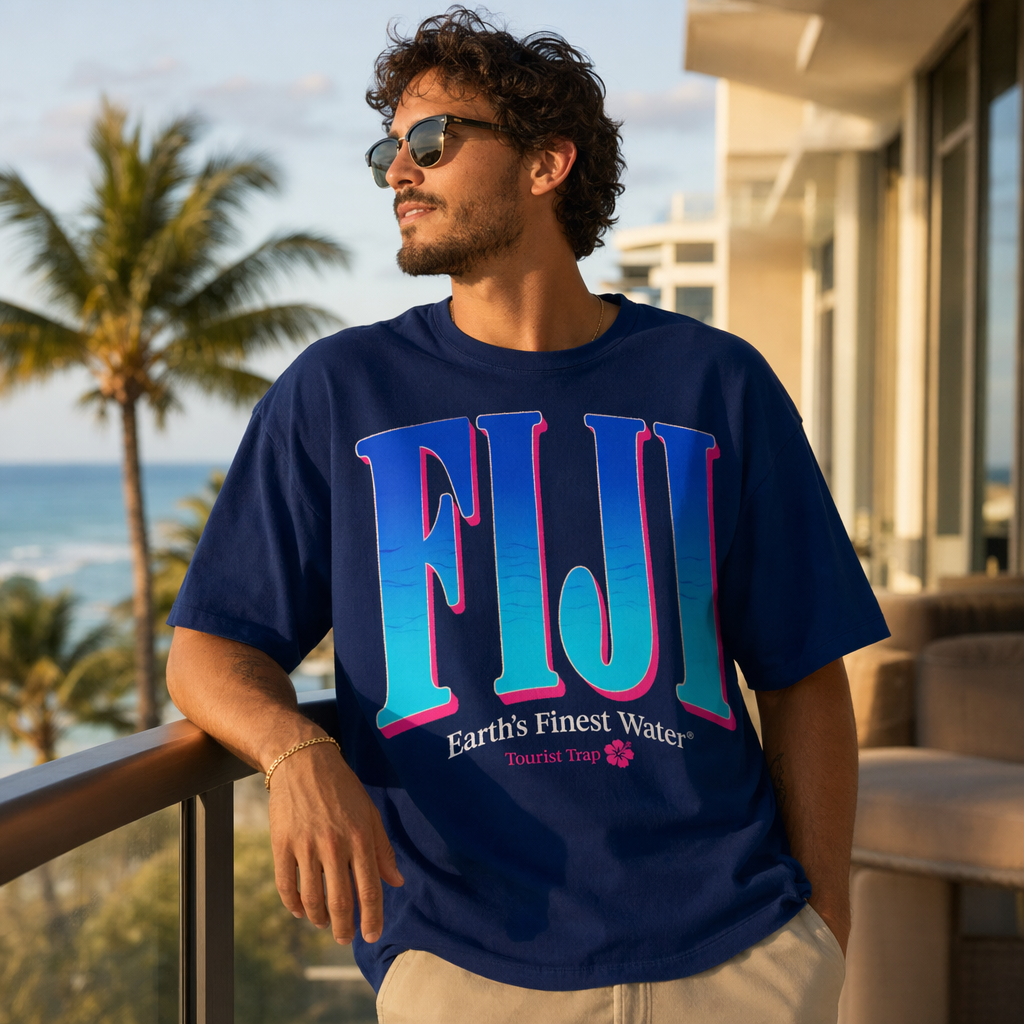 Photorealistic on-body lifestyle shot of a unisex “Tourist Trap Tee” worn in an everyday-escape setting. The model is casually leaning on a balcony railing of a modern beachfront apartment at golden hour, ocean and soft-focus palm trees in the background. Model vibe: laid-back, well-traveled, effortlessly stylish, wearing relaxed chino shorts and minimal jewelry. T-shirt color: crisp PMS 296 navy for a fashion-forward look. Oversized chest graphic: a huge faux-vintage FIJI wordmark in a tall, condensed serif that feels like an old souvenir shop sign, spanning almost from side seam to side seam. The base letters are in bright FIJI bottle gradient blues (from #003DA5 to #00C1D5), with a thick neon magenta (#E10098) offset shadow thrown down and to the right, creating a glowing, almost 3D effect. The edges of the letters have subtle distortion, like warped by tropical heat, plus tiny, almost hidden wave ripples cutting through the fill, keeping it playful but still clean. Beneath the main logo, smaller curved text reads “Earth’s Finest Water®” in white serif, with “Tourist Trap” and a small hibiscus icon in magenta as a cheeky subline. Print finish: smooth, slightly satin ink, well-registered and premium. The tee fits slightly boxy and relaxed, sleeves just above the elbow. Lighting: warm, directional golden-hour sun from one side, casting soft shadows and giving the ink a slight sheen; background stays slightly blurred to keep focus on the tee. Color palette: deep navy, electric FIJI blues, and hibiscus magenta as the hero accent, clearly showing the brand’s signature blue + magenta pairing through a fashion lens on everyday life. Camera: mid-shot from the waist up, straight-on angle, capturing the logo clearly while showing the relaxed, escapist atmosphere.