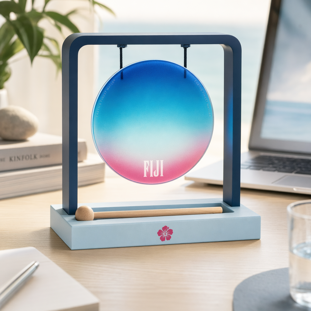 Photorealistic studio render of a FIJI Water branded minimalist desktop gong-style meditation timer, designed as a small affordable-luxury ritual object for a work-from-home desk. The frame is a clean square arch, echoing the iconic FIJI bottle silhouette: satin-finished anodized aluminum in deep FIJI navy (#041C2C). Suspended in the center is a perfectly round disk of thick frosted glass infused with a soft FIJI gradient: top in primary FIJI blue (#003DA5) melting into bright light blue (#00C1D5) with a subtle halo of hibiscus magenta (#E10098) at the lower edge, like a sunset reflected in water. The disk has a tiny, discreet FIJI wordmark in white near the bottom and the line “Earth’s Finest Water®” etched in micro-type around the rim, only visible in close-up. A slim wooden striker with a pale, beachy ash finish rests in a carved groove in the base. The base is a low square plinth, FIJI light blue (#BBDDE6) with a very fine matte texture, front edge debossed with a tiny magenta hibiscus icon. Lighting is soft, directional daylight as if coming from a nearby window: gentle highlights on the metal frame, translucent glow through the frosted glass disk. Background is an out-of-focus serene workspace: pale wood desk, blurred laptop, a leafy plant, soft ocean-colored tones but no clutter. Camera is a 3/4 front angle, slightly above eye level, focusing on the object with shallow depth of field so the ritual timer feels like an intimate, personal piece of everyday calm, not ostentatious. Hyper-real materials, crisp reflections, no harsh shadows, overall mood relaxed, cool, well-traveled, effortless luxury.