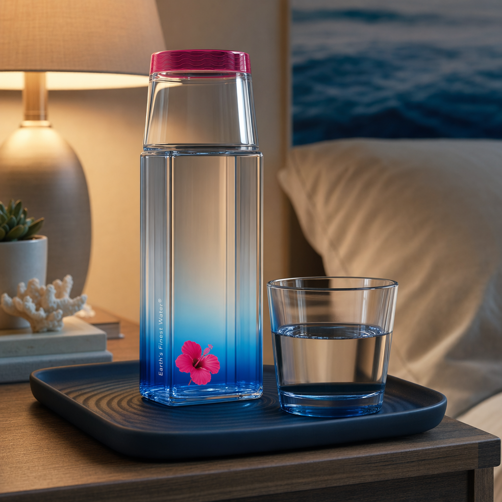 Photorealistic product render of a FIJI Water “finest moments” bedside carafe-and-glass set that turns nightly hydration into a small escape ritual. A square-based glass carafe echoes the FIJI bottle proportions, made from ultra-clear crystal with a very subtle vertical faceting that catches light like water. The base of the carafe has a soft internal gradient tint: deep FIJI blue (#003DA5) at the very bottom, fading smoothly into bright light blue (#00C1D5) and then clear, suggesting natural spring water rising. A delicate magenta (#E10098) hibiscus icon is printed near the lower corner, with “Earth’s Finest Water®” in tiny, refined white type along one vertical edge. The matching tumbler inverts over the top as a lid: its base ring is tinted hibiscus magenta with a faint wave pattern, while the rest is clear glass, creating a blue-and-magenta pairing when nested. Both pieces sit on a slim, rounded-square tray in matte navy (#041C2C) with a soft-touch, almost ceramic finish, and a micro-embossed ripple texture radiating from the center, like water in a pool. Background is a softly lit nightstand scene: blurred linen bedding in neutral tones, a warm, small bedside lamp casting gentle golden highlights onto the glass, and a hint of an ocean-print art piece in cool blues on the wall. Camera is a close 3/4 angle at table height, shallow depth of field, focusing sharply on the rim of the tumbler and the gradient in the carafe. The overall mood is relaxed, intimate, affordable luxury for a nightly wind-down ritual, with no flashy branding—just confident, iconic FIJI color and form.