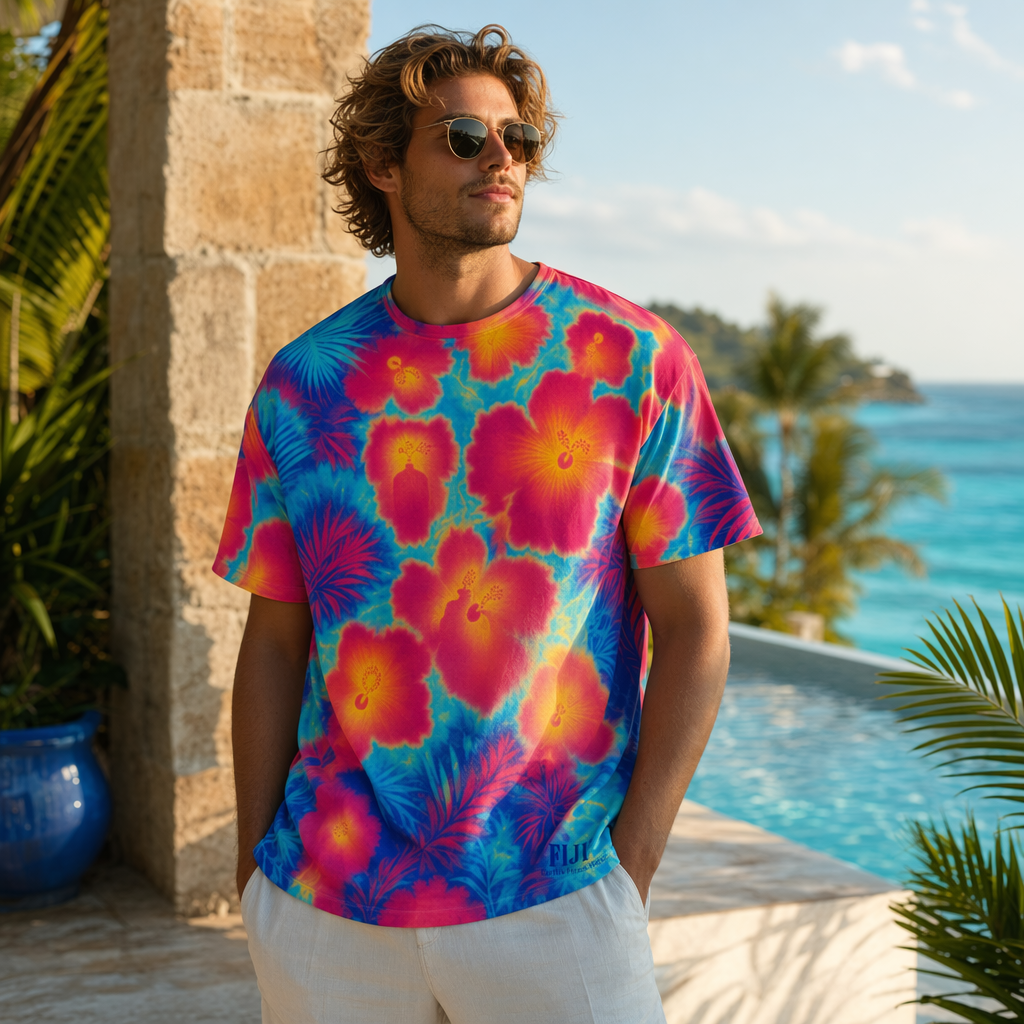 Lifestyle-on-body photorealistic render of the FIJI “Hibiscus Heat Map Tee” styled as effortless, beach-to-city wearable art. A laid-back, well-dressed model stands in soft shade near a sunlit pool or coastal balcony; they wear a relaxed, slightly boxy tee with premium cotton-jersey drape. The shirt features an all-over abstract hibiscus thermal-camera print: large and small hibiscus silhouettes and palm fronds melt into each other as gradient islands of color, with the hottest areas in saturated hibiscus magenta (#E10098) and golden yellow radiating from flower centers, shifting into cyan and rich FIJI blue (#003DA5) at the edges, plus pockets of bright light blue (#00C1D5) so the pattern feels like a tropical weather radar or heat map over water. The pattern subtly hints at FIJI’s square bottle silhouette in a few heat-map shapes, almost hidden easter eggs. A tiny FIJI wordmark and the line “Earth’s Finest Water®” sit tone-on-tone at the lower hem in navy, barely visible unless you look closely, keeping the vibe personal and non-flashy. Fabric surface is matte with a luxe, slightly brushed finish, no gloss, colors richly dyed. Background is softly blurred: turquoise water glints, palm leaves, and a hint of sunlit stone, all in the FIJI palette so the tee feels like part of a relaxed escape scene. Lighting is golden-hour soft, with warm highlights on the shoulders and natural shadows under the arms to emphasize drape and structure. Camera is three-quarter body, eye level, centered on the tee, with enough resolution to see the heat-map gradients and hibiscus details while keeping the overall mood calm, confident, and effortlessly cool.