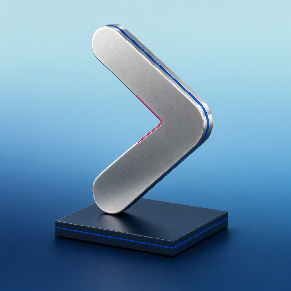 Photorealistic studio render of a minimal, premium FIJI Water-inspired desk gong sculpture shaped as a bold, floating ‘⋻’ character. The object is made from brushed stainless steel with a soft satin finish, sitting on a low, square base in deep FIJI navy (#041C2C). A slender inlaid stripe of FIJI electric blue (#003DA5) wraps the edge of the ⋻ form, with a subtle hibiscus magenta (#E10098) accent line at its inner angle, clearly pairing blue and magenta. The piece feels like an ‘everyday ritual’ object for a well-designed workspace: small, personal, affordable luxury. Soft overhead daylight with a slight cool tint creates gentle reflections along the metal, emphasizing curvature without harsh glare. Background is a smooth gradient from light FIJI ice-blue (#BBDDE6) at the top to navy at the bottom, echoing the FIJI bottle gradient vibe. Camera is front three-quarter view, slightly above eye level, showing the full ⋻ form and base, with a shallow depth of field that gently blurs the background but keeps the object hyper-detailed. No logos; rely on color palette, square base, and refined finish to evoke FIJI’s ‘Earth’s Finest Water’ relaxation territory.