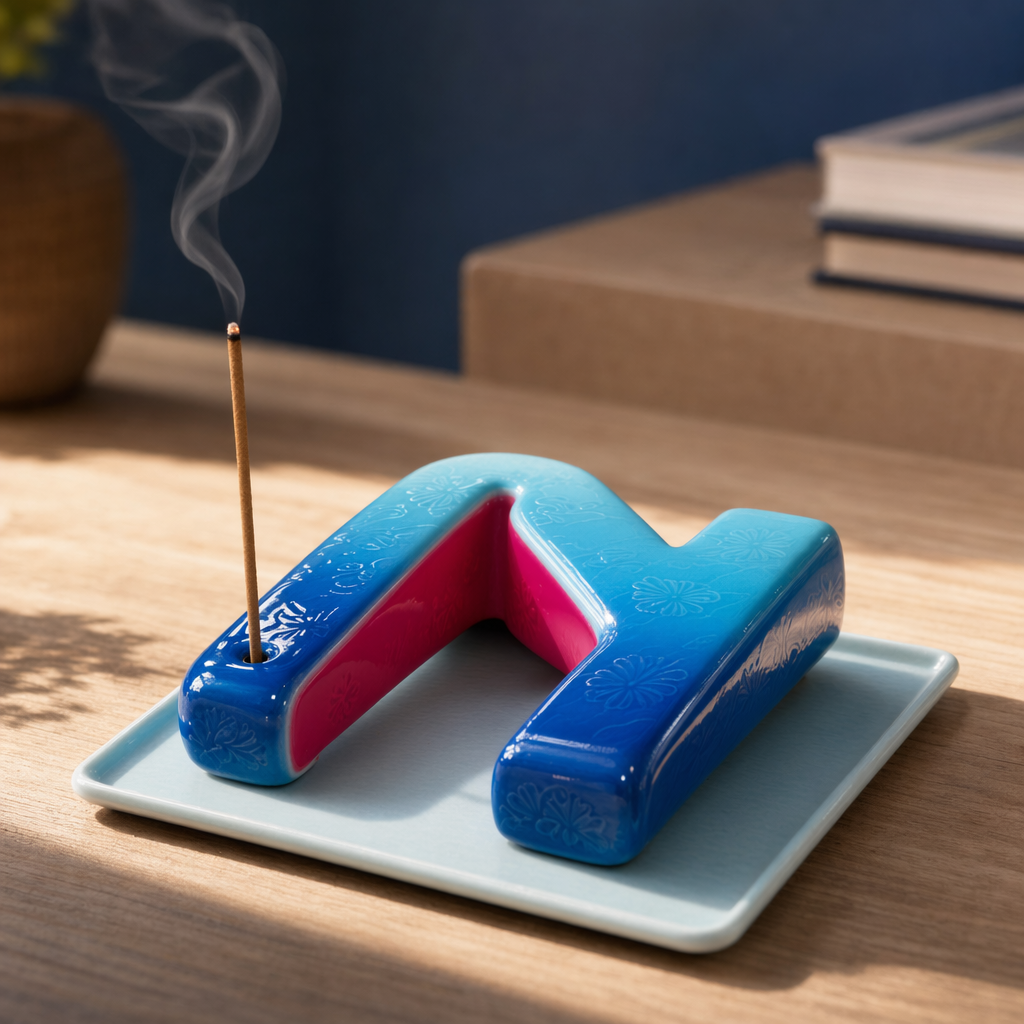 Photorealistic product render of a FIJI Water-inspired ceramic incense holder in the exact shape of the ‘⋻’ symbol, designed as an at-home relaxation ritual object. The ⋻ form lies horizontally like a low bridge, with a tiny drilled hole at one end to hold a single incense stick. The ceramic is high-gloss, dipped in a FIJI blue-to-bright-light-blue gradient (#003DA5 to #00C1D5) along the outer surfaces, with the inner planes flooded in hibiscus magenta (#E10098), so blue and magenta pair boldly and playfully. A faint debossed hibiscus petal pattern catches the light on close inspection, tying to FIJI’s island escape mood without feeling ostentatious. The holder rests on a very thin, square tray in pale ice blue (#BBDDE6) to catch ash. Lit by warm, late-afternoon window light from the left, with visible soft shadows and a wisp of incense smoke drifting upward, suggesting calm, personal ritual. Background: blurred interior scene with hints of a neutral wood tabletop and a soft navy wall, nothing distracting, slightly desaturated to keep focus on the object. Camera at low, close-up three-quarter angle, macro-level detail on glaze, reflections, and smoke. No explicit bottle art; the square tray, palette, and tranquil styling clearly place it in FIJI’s ‘Your Finest Moments’ territory.