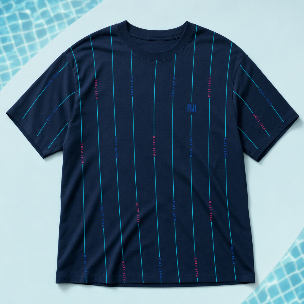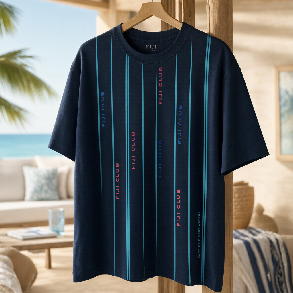 input: 24. Ocean Club Tee — Navy tee with cyan vertical stripes and small repeated “FIJI CLUB” text, inspired by club flyers and resort signage.