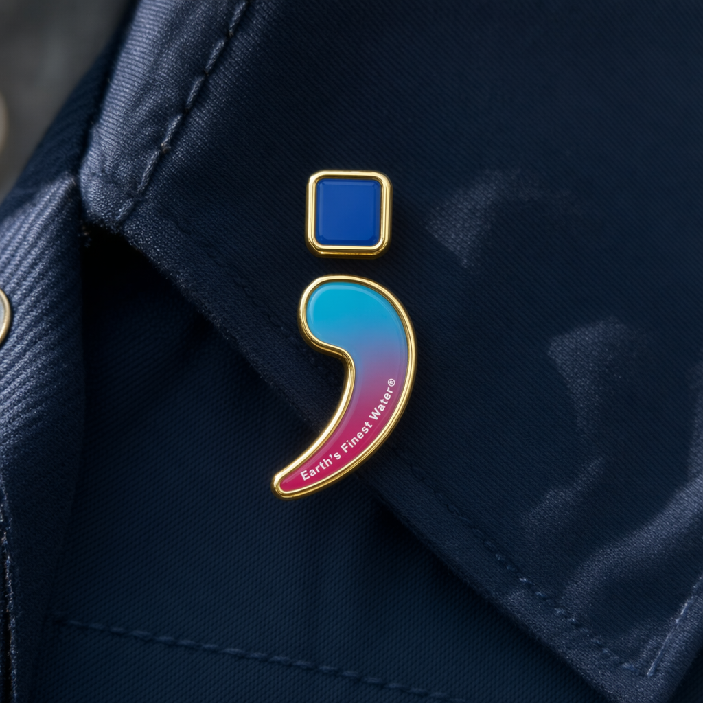 Photorealistic close-up of a FIJI Water branded enamel pin shaped as a minimal, elegant semicolon symbol. The semicolon is formed by a small square dot and a soft curved stroke, subtly echoing the iconic FIJI bottle’s square footprint. Premium hard enamel with a glossy finish: the dot is FIJI primary blue (#003DA5) bordered in polished gold metal, and the curved stroke is a smooth gradient from bright light blue (#00C1D5) into hibiscus magenta (#E10098), showcasing the brand’s signature blue + magenta pairing. Tiny, precise white lettering along the curve reads “Earth’s Finest Water®” in a refined sans serif, very small but crisp. The background is a softly blurred navy (#041C2C) fabric surface, like a casual but high-quality cotton twill jacket or tote, with natural daylight coming from the left, creating subtle specular highlights on the glossy enamel and gold trim. Shallow depth of field so the pin is sharply in focus, fabric texture and stitching slightly out of focus. Overall mood: laid-back, personal, a quiet token for everyday rituals and self-reflection, not flashy, just a small piece of affordable luxury you’d wear daily.