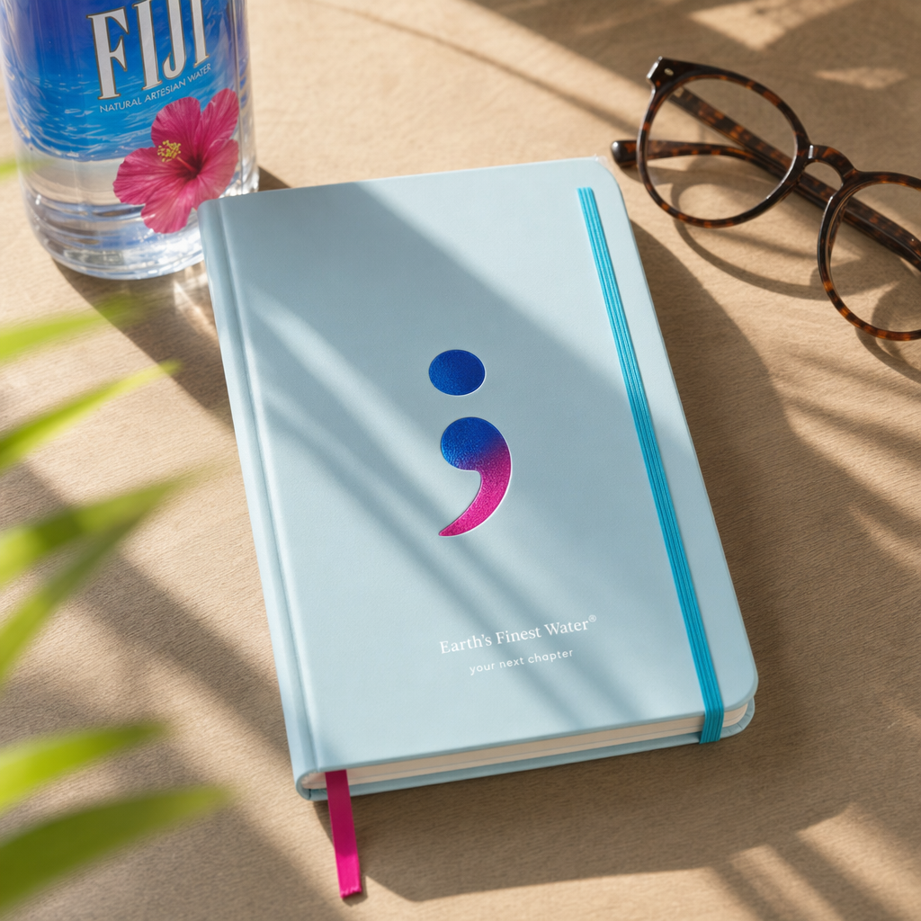 Flat-lay, photorealistic shot of a FIJI Water ‘semicolon’ ritual notebook set on a sunlit table. A medium-sized, soft-touch hardcover notebook in FIJI light blue (#BBDDE6) sits centered, with a debossed and foil-stamped semicolon symbol in the middle of the cover. The semicolon mark is clean and modern, printed in a rich FIJI blue (#003DA5) with the tail fading into hibiscus magenta (#E10098), forming a subtle gradient that feels fluid, like a drop of water in motion. Beneath the symbol, small, understated text in white reads “Earth’s Finest Water®” and, even smaller, “your next chapter” as a nod to personal, everyday rituals. The notebook has rounded corners and a matching elastic band in bright light blue (#00C1D5), plus a single magenta ribbon bookmark peeking out. Surrounding props are minimal and relaxed: a clear FIJI bottle slightly out of focus to the side, a pair of tortoiseshell reading glasses, and soft tropical sunlight casting leaf shadows across the scene, evoking escape without being ostentatious. The background surface is a light, warm wood; lighting is natural mid-morning daylight with soft shadows, emphasizing the notebook’s matte, premium texture and the metallic sheen of the foil-stamped semicolon.