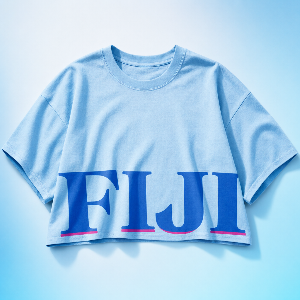Photorealistic studio shot of a women’s oversized cropped FIJI t‑shirt laid flat on a seamless backdrop. The tee is boxy and slightly wide with dropped shoulders, a roomy body, and a straight, raw or clean-hemmed crop that hits just above the waist. Fabric is premium midweight cotton jersey with a smooth, slightly matte finish, visible soft texture and minimal sheen, in solid PMS 7457 light blue. Across the front chest is an enormous FIJI wordmark: classic FIJI type in primary FIJI blue (PMS 293), scaled so large that only the bottom half of the letters are visible on the shirt, creating a bold cut-off poster effect – cropped horizontally by the hem so you see just the lower strokes and serifs of the logo wrapping toward the side seams. A thin magenta (PMS Rhodamine) underline bar or subtle shadow accent sits under the cropped letterforms, reinforcing the signature blue + magenta pairing. Back of tee is clean, no graphics. Lighting is soft, diffused daylight from above and slightly to the left, with gentle shadows that define folds and drape. Background is a simple ice-blue to white gradient field that echoes FIJI’s bottle gradients, slightly out of focus. Camera is top-down, slightly offset angle to show the boxy silhouette and crop length clearly, with a close crop that keeps the tee hero and uses shallow depth of field for a premium e‑commerce look.