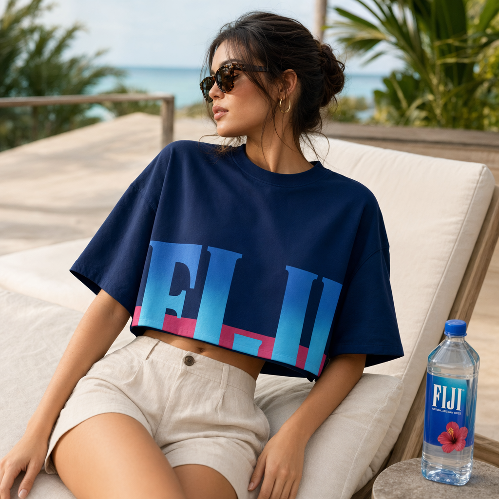 Photorealistic lifestyle scene of an oversized cropped FIJI logo tee worn by a model in a relaxed, escapist setting. The tee has a boxy, fashion-forward silhouette with dropped shoulders, generous sleeves that hit mid-bicep, and a straight cropped hem that lands just above high-waisted linen shorts. Fabric is high-quality cotton with a slightly substantial weight and ultra-soft hand, in deep navy (PMS 296) for a modern, elevated base. On the front, a massive FIJI wordmark spans nearly from side seam to side seam: the letters are in primary FIJI blue (PMS 293) with a subtle inner gradient of bright light blue (PMS 3115), but the entire logo is positioned so low that only the bottom half of each letter appears on the tee, chopped cleanly by the crop hem and partially hidden by a light fold, creating a bold cut-off poster effect. A slim magenta (PMS Rhodamine) bar runs horizontally behind the lower parts of the letters, peeking out to create the signature blue + magenta contrast. The model is seated on a sunlit terrace lounge chair with soft white cushions, a blurred hint of ocean and palm greenery in the background, plus a FIJI bottle on a small side table. Lighting is warm late-afternoon natural light, with soft highlights on the fabric and gentle shadows, reinforcing a laid-back, vacation-relaxation mood. Camera is framed waist-up at a slight three-quarter angle, focusing on the cropped hem interacting with the oversized logo, shallow depth of field so background is softly defocused while the tee details are tack sharp.