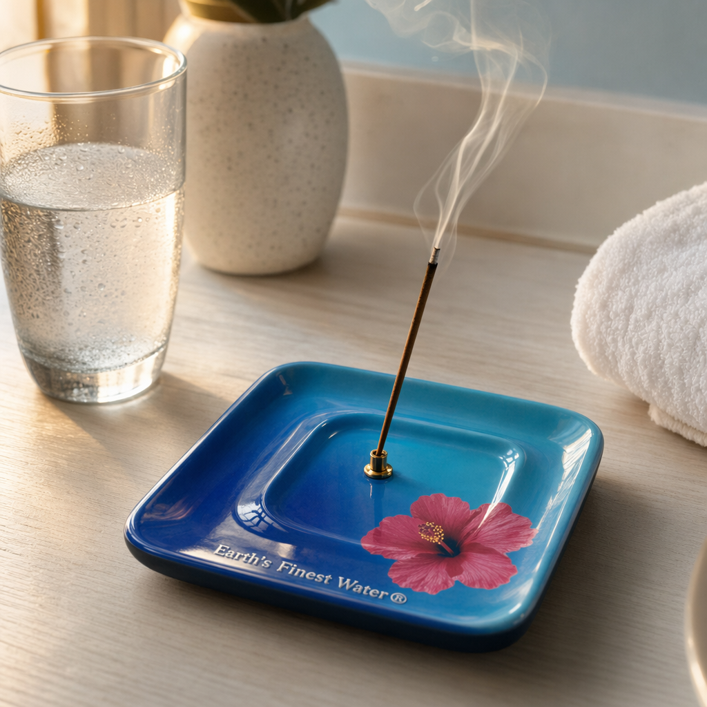 Photorealistic studio mockup of a FIJI Water-inspired square incense tray called “Your Finest Moments”. The tray is glossy ceramic, shaped as a soft square to echo the FIJI bottle silhouette, with a shallow center well and a single off-center incense holder pin. Top surface features a serene gradient from deep FIJI blue (#003DA5) at one corner blending into bright light blue (#00C1D5), with a subtle magenta (#E10098) hibiscus floral accent in one corner. The words “Earth’s Finest Water®” are debossed in small, tasteful type along one edge in white, almost tone-on-tone. Underside of the tray is matte navy (#041C2C). Incense smoke rises softly, lit by warm, low sunset light from the left, creating gentle reflections on the glossy ceramic. Background is an unfussy, slightly out-of-focus bathroom vanity or bedside table scene: pale, ice-blue (#BBDDE6) wall, a folded white towel, a simple glass of water with condensation. Camera is a close-up 3/4 angle at table height, shallow depth of field, emphasizing affordable luxury, relaxation, and an intimate nightly ritual rather than ostentatious display. No people in frame, just the object in use.