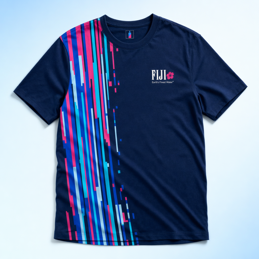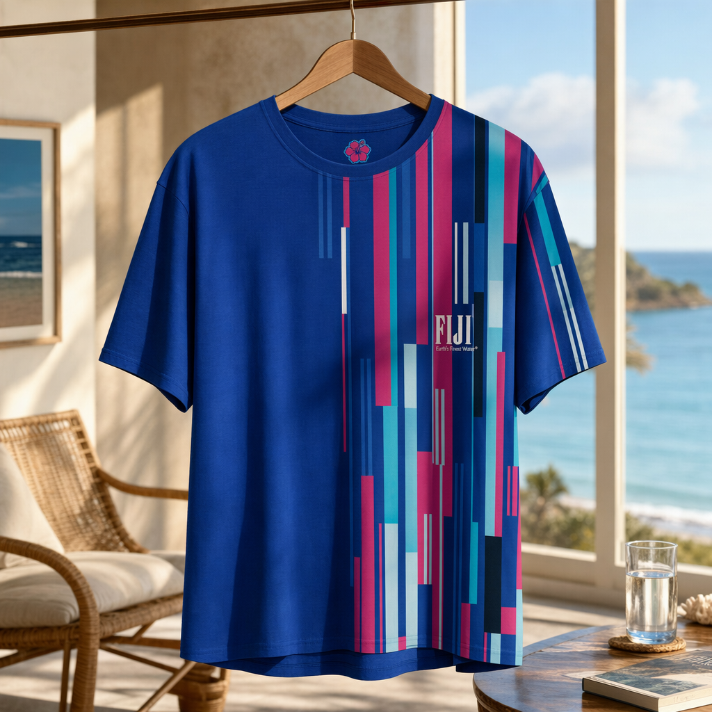 Photorealistic studio shot of a premium unisex longline tee laid flat, slightly angled. Fabric is soft, high‑quality cotton with a smooth, slightly silky finish. Base color of the tee is deep navy (PMS 296 / #041C2C). From the left shoulder down to the hem, a bold “island glitch” pattern of cascading vertical bars runs the full length of the shirt: alternating bright hibiscus magenta (PMS Rhod. / #E10098), FIJI primary blue (PMS 293 / #003DA5), bright light blue (PMS 3115 / #00C1D5), and light ice blue (PMS 7457 / #BBDDE6). The bars vary in width and length, some pixel-offset to create a digital glitch feel that still looks clean and wearable, like a fashion-forward graphic from a luxury resort brand. On the upper left chest, over the pattern, a small, discreet FIJI Water wordmark in white with a tiny magenta hibiscus icon sits just above the phrase “Earth’s Finest Water®” in a refined, minimalist sans-serif. Back of neck has a tiny square icon inspired by the FIJI bottle, split blue and magenta. Lighting is soft and even, with subtle highlights that show the cotton weave and drape, shot against a very light blue gradient background that fades to white, evoking a calm, oceanic atmosphere. Camera framing is top-down, medium distance, capturing the full tee with a small natural shadow around the edges, conveying relaxed, affordable luxury streetwear with a laid-back island glitch aesthetic.