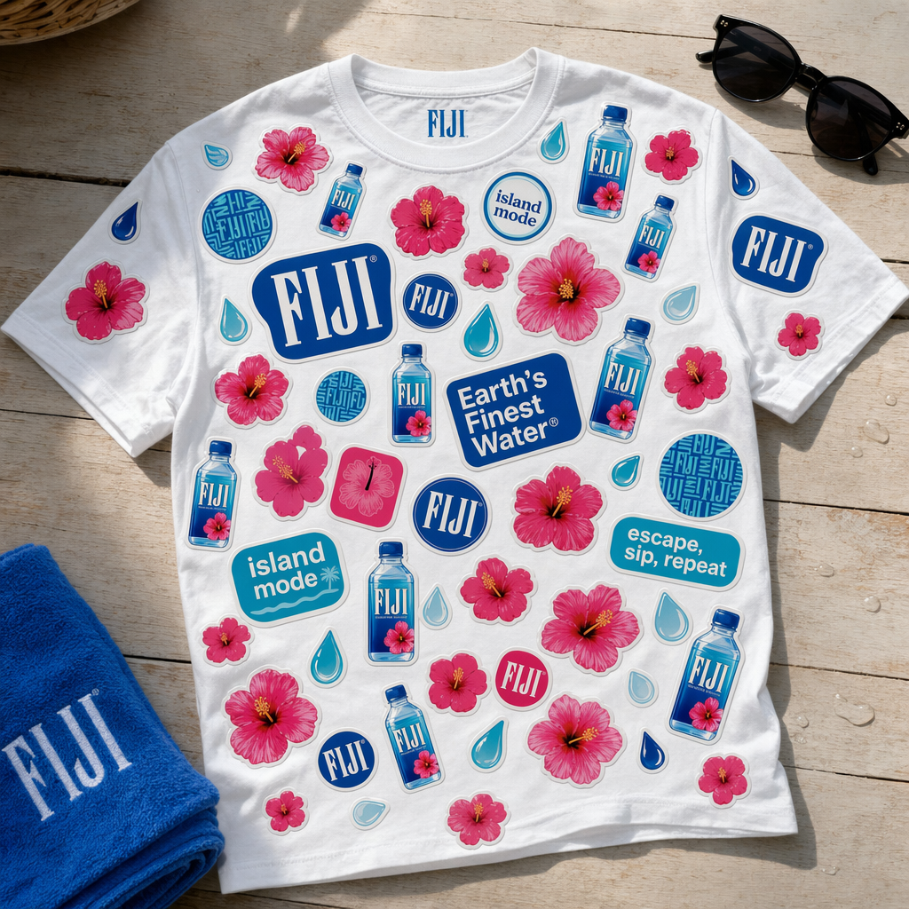 input: 28. Tropical Sticker Tee — White tee covered in sticker-like blue and pink FIJI logos, hibiscus icons, water drops, and mini “island mode” badges.