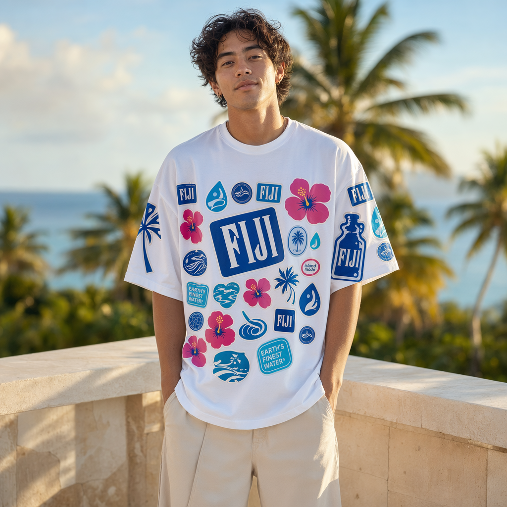 Photorealistic on-body shot of a Tropical Sticker Tee styled with a fashion-lens streetwear vibe but in a relaxed, resort setting. A casually well-dressed model stands on a light stone terrace overlooking soft-focus tropical greenery and a hint of ocean blue in the background. The T-shirt is crisp white, slightly oversized with dropped shoulders and a drapey, premium cotton jersey. The design uses a gridded collage of “stickers” across the front and wrapping subtly onto one sleeve: mini FIJI bottle silhouettes, square FIJI wordmark blocks, hibiscus blossoms, palm icons, and liquid water-drop symbols. Each element looks like a high-end matte vinyl sticker with a soft satin sheen and a faint white keyline. Dominant sticker colors are FIJI blue (#003DA5), navy (#041C2C), bright light blue (#00C1D5) and hibiscus magenta (#E10098), with a few ice-blue grounds (#BBDDE6) to create depth. Interspersed among the icons are small ‘island mode’ and ‘Earth’s Finest Water®’ badges, set in rounded rectangles and circles, like collectible patches from different “fine moments.” Lighting is golden-hour side light, flattering and warm, creating soft highlights on the stickers and gentle shadows in the tee’s folds. Camera frames the model from mid-thigh up, straight-on, with shallow depth of field so the tee graphics are tack-sharp while the palm trees and sky blur into an aspirational but effortless escape backdrop.