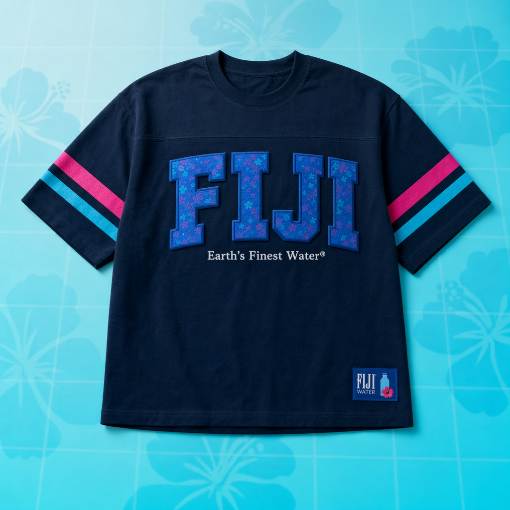 Photorealistic product shot of an oversized unisex digital hibiscus football tee laid flat on a seamless backdrop, styled like a premium lifestyle e‑comm image. The tee is heavyweight cotton jersey with a soft, slightly brushed texture, structured but relaxed, with a boxy, drop-shoulder silhouette and athletic football yoke stitching. Base color: deep FIJI navy (#041C2C). Across the chest, bold varsity block letters read “FIJI” in bright FIJI blue (#003DA5) with a subtle 3D puff-ink effect; inside the letterforms, a very fine digital hibiscus pattern appears as a tonal glitch—pixelated magenta and bright aqua fragments that are visible up close but read as clean from afar. Below the chest graphic, the small campaign line “Earth’s Finest Water®” is printed in crisp white, understated and centered. Classic twin sleeve stripes wrap each upper arm: one hibiscus magenta (#E10098) stripe and one bright light blue (#00C1D5), printed with a matte athletic-ink finish. On the lower front corner, a small woven jock-tag style label in FIJI blue with a mini bottle icon and hibiscus mark signals the brand, stitched neatly for a premium feel. Lighting is soft studio light from 45 degrees with a slight top fill, creating gentle shadows that reveal fabric thickness and texture, no harsh reflections. Background is a smooth ice-blue gradient (#BBDDE6 to #00C1D5) with a faint, out-of-focus hibiscus motif and square grid hinting at digital “field lines,” reinforcing a laid-back sports-luxe mood without feeling like hardcore athletic gear. Camera is overhead, perfectly centered, capturing the full tee with a slight vignette to focus attention on the chest graphic and sleeve stripes, no model, no props, just clean photoreal detail.