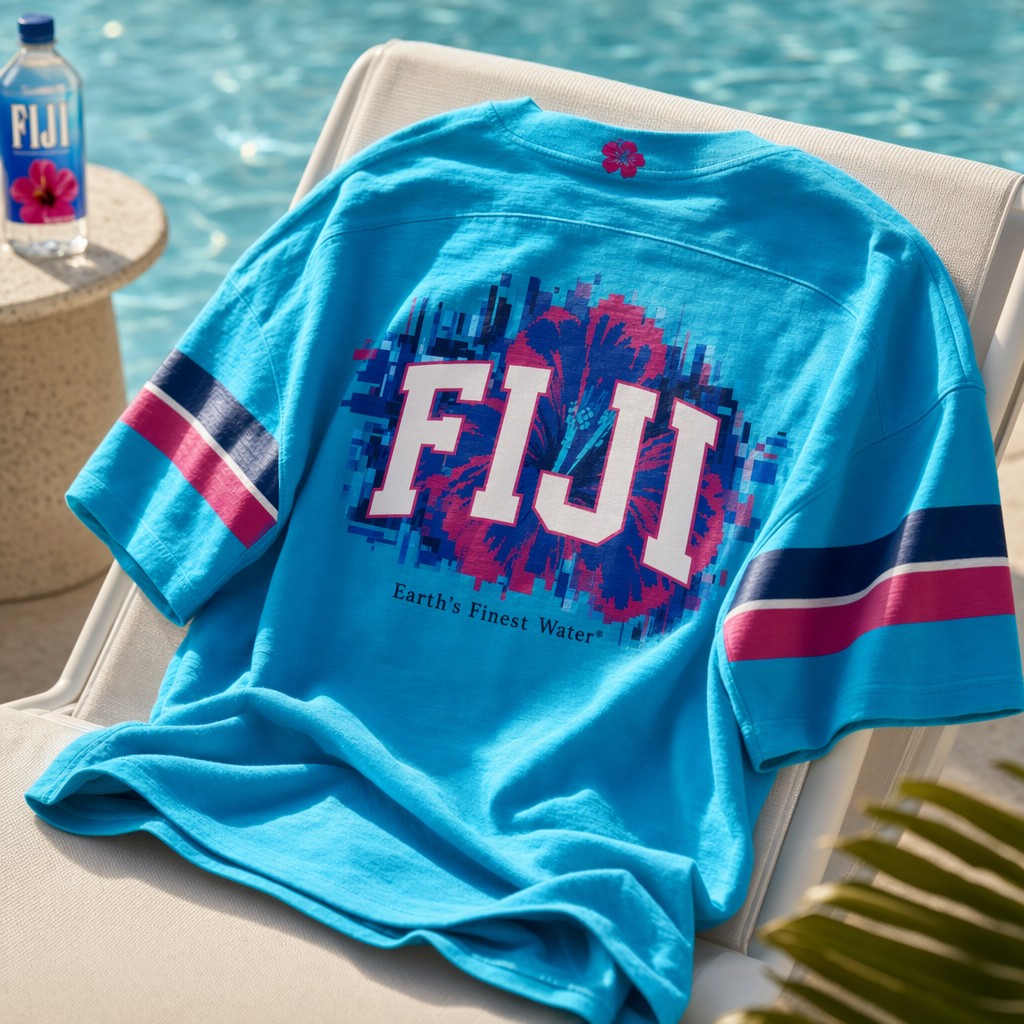Photorealistic lifestyle product image of an oversized unisex digital hibiscus football tee draped on a low white lounge chair by a sunlit pool, conveying relaxation and escape rather than intense sport. The tee is ultra-soft, midweight cotton with a slightly slubby texture and roomy, boxy cut with dropped shoulders and a curved football yoke seam. Base color is FIJI electric blue (#00C1D5) that echoes the bottle gradient. Across the chest, “FIJI” appears in large, retro-varsity letters in clean white with a thin hibiscus magenta (#E10098) outline; behind and around the letters, a glitch hibiscus graphic looks like a digitally fragmented flower—overlapping pixel blocks and soft gradients in navy (#041C2C), FIJI blue (#003DA5), and magenta, fading out toward the side seams so it feels playful and modern, not busy. Under the main wordmark, very small, refined text reads “Earth’s Finest Water®” in navy, centered. Each sleeve has broad, athletic-style stripes: a navy band and a magenta band with a narrow white pinstripe separating them, printed in slightly glossy ink to catch the sun. A tiny embroidered hibiscus in magenta sits at the back neck, visible where the tee folds over the chair. The scene is shot outdoors in soft late-afternoon light with gentle, warm highlights and clear, realistic shadows; the pool water in the background is a calm, turquoise blur with subtle caustic reflections, and a FIJI bottle is barely visible out-of-focus on a side table, reinforcing brand without dominating. Camera angle is three-quarter, slightly above and to the side, focusing on the chest graphic and sleeve detail while showing the relaxed drape of the fabric over the chair; depth of field is shallow so the tee is razor sharp and the environment softly blurred, creating an effortless, aspirational yet attainable resort-lounge vibe.