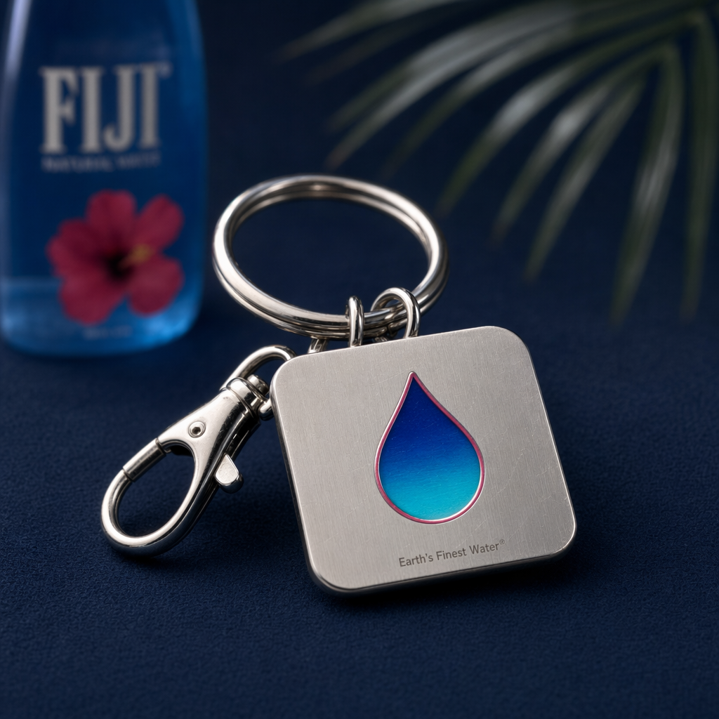 Photorealistic product shot of a FIJI Water-inspired luxury key charm shaped like a minimal square water droplet icon, designed as an everyday carry reminder to take a breath and escape. The charm is a small, solid metal square with softly rounded corners and a cut-out droplet in the center, finished in brushed stainless steel with a smooth, premium feel. The front face features a subtle FIJI blue (#003DA5) to bright light blue (#00C1D5) gradient enamel in the droplet cut-out, with a thin magenta (#E10098) hibiscus-pink outline around the droplet for the brand’s signature blue + magenta pairing. On the lower edge of the square, laser-etched in tiny but crisp type, is the line: “Earth’s Finest Water®”. The back is clean metal with a very small FIJI logomark centered. The charm is attached to a minimal high-polish silver split ring and a small lobster clasp, so it can clip onto keys, a beach tote, or a golf bag. Surface details: fine micro-brushed texture, soft reflections, tiny hairline scratches visible at macro level to emphasize realism. Lighting: soft, natural daylight coming from the upper left, like sunlight filtered through a window near the ocean, creating gentle highlights on the metal and a faint, diffused shadow to the right. Background: a clean navy (#041C2C) backdrop with a very soft-focus vignette, and faint out-of-focus hints of a FIJI bottle silhouette and palm leaf shapes in the distance, tone-on-tone so they don’t distract. Camera: close-up macro shot at a slight 3/4 angle, shallow depth of field so the charm and key ring are razor sharp while the background falls into a creamy blur, capturing the object as a small, affordable luxury object that feels personal, calm, and quietly playful.