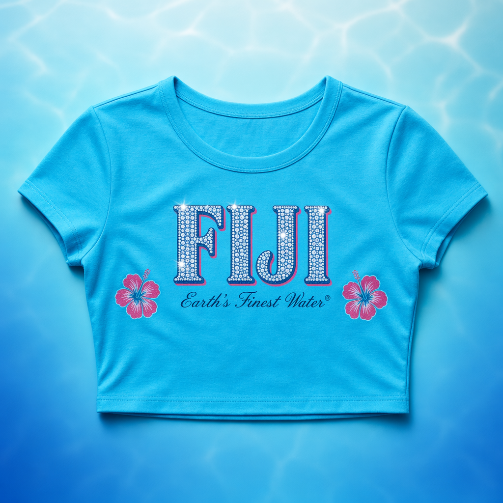 Photorealistic product shot of a FIJI Water “Y2K Resort” baby tee, small fitted women’s crop-length T‑shirt laid flat on a seamless studio backdrop. Tee color: saturated FIJI cyan (close to PMS 3115/293 mix), with a subtle sheen, high-quality cotton-modal blend that feels like affordable luxury, not fast fashion. Center chest graphic: sparkling rhinestone-style FIJI logotype, but printed with high-gloss ink to mimic crystal studs without bulk; letters in signature FIJI blue with a soft white highlight and a subtle magenta drop shadow for a 3D Y2K effect. Around the logo, tiny hibiscus side graphics at the lower left and right ribcage area: delicate magenta hibiscus blooms with thin cyan outlines, echoing the bottle flower, not cartoonish. Under the logo in small, elegant script: “Earth’s Finest Water®” in navy, very clean. Tee has a slightly wide crew neck, short cap sleeves, and a snug, 90s-inspired baby tee silhouette. Print application looks premium: crisp edges, no cracking, perfectly registered layers. Background: smooth gradient from light ice blue at the top (PMS 7457) to deeper FIJI blue at the bottom, with a faint soft-focus pool-light reflection pattern to evoke resort relaxation. Lighting: soft, diffused studio light from above with gentle side fill, minimal shadows, making the fabric texture and glossy print details visible. Camera: straight-on top-down flatlay, centered, slight vignetting at corners for focus. No model, no props, no wrinkles; emphasizes color palette, playful Y2K resort aesthetic, and FIJI’s blue + magenta pairing as a fashion-forward everyday ritual piece.